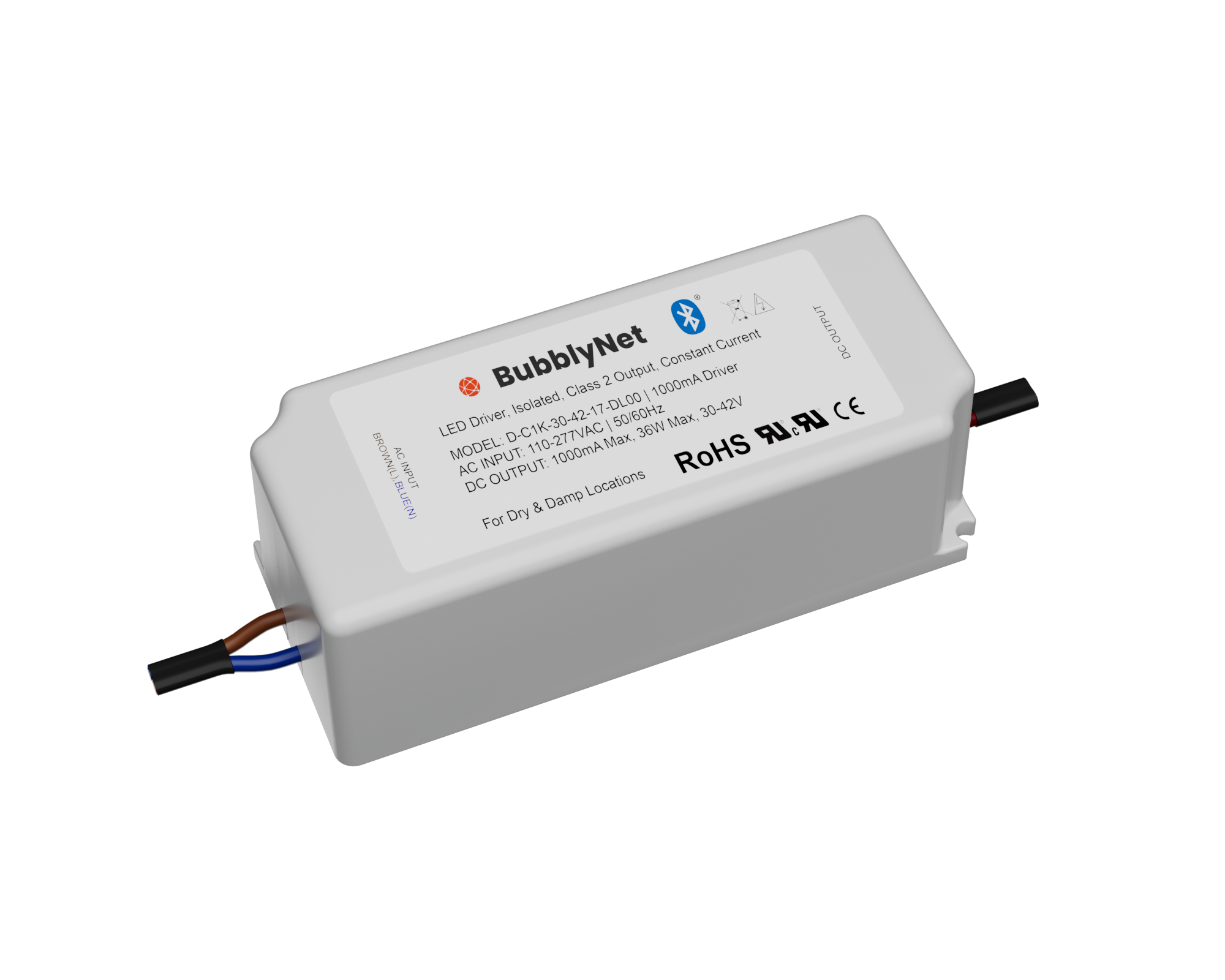 The installation of the D-C1K-30-42-17-DL00 is very simple. The two wires for universal AC input are connected to the driver. As soon as the driver is powered on it will start broadcasting the non-provisioned advertising messages that will tell the provisioning app that a new device is ready to join. The provisioning app will connect to the new driver, configure security keys, addresses and other data so the new driver can join the Mesh Network. After the new driver joins the Mesh Network it is ready to be configured (publishing / subscribing data.)
