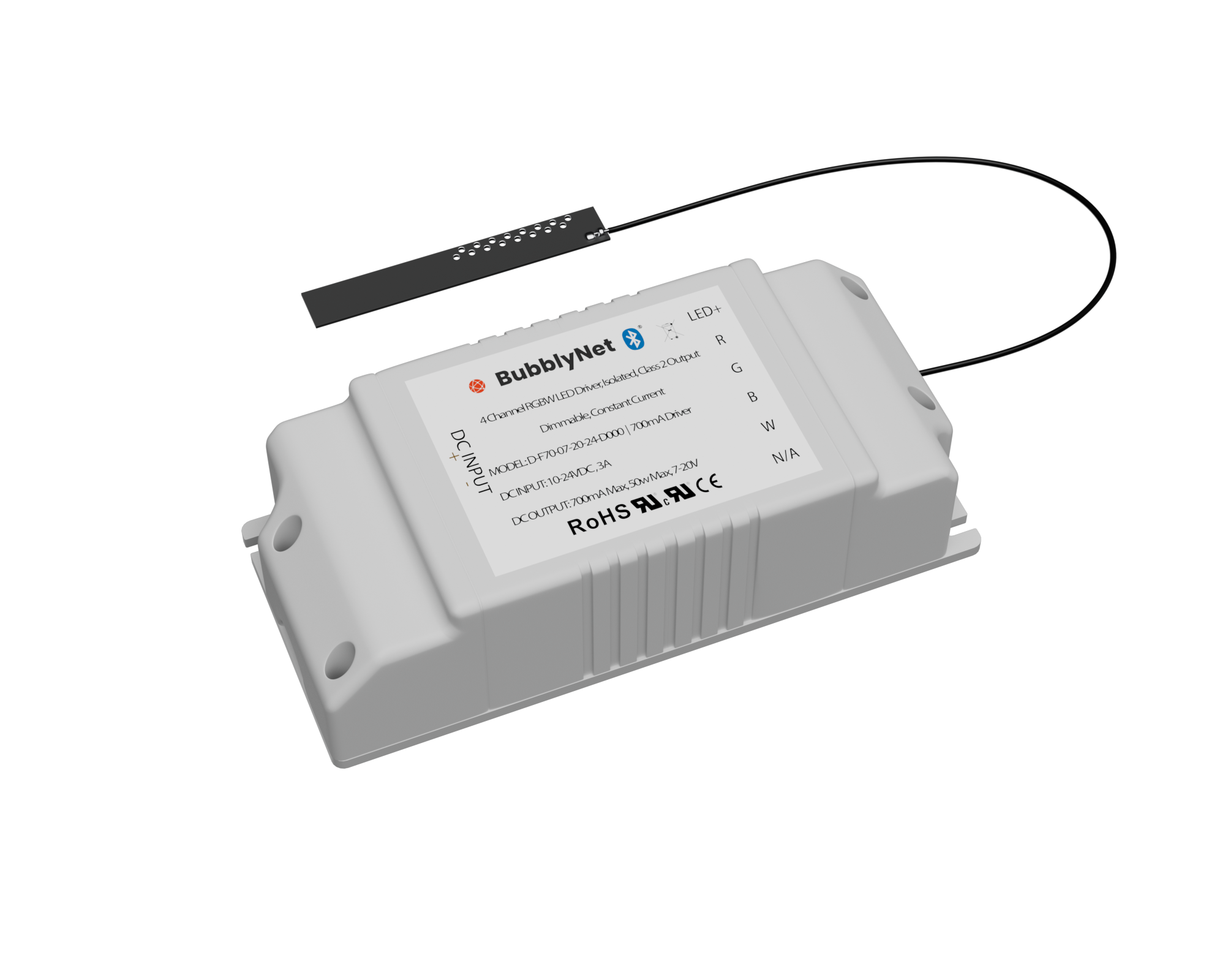 The D-F70-07-20-24-D000 operates on 24VDC. The four channels are used to mix different light sources for a variety of applications. Once powered up, the device broadcasts its identification code waiting to be commissioned through the Bubblynet App.