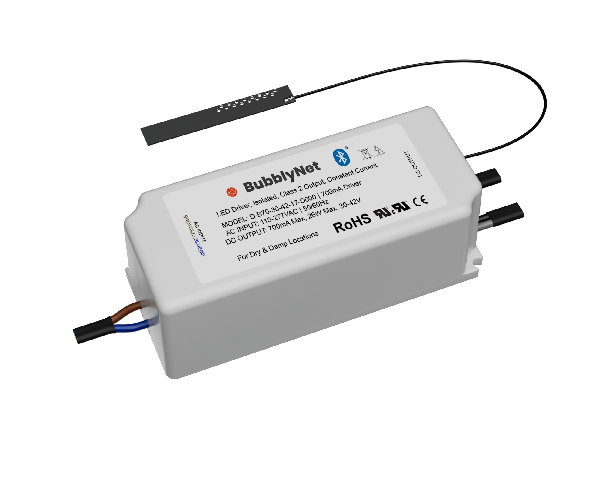 The D-B70-30-42-17-D000 operates on 110-277V. The two channels are used to mix different light sources for Tunable White applications. Once powered up, the device broadcasts its identification code waiting to be commissioned through the BubblyNet App. The installation of the D-B70-30-42-17-D000 is very simple. The two wires for universal AC input are connected to the main line.
