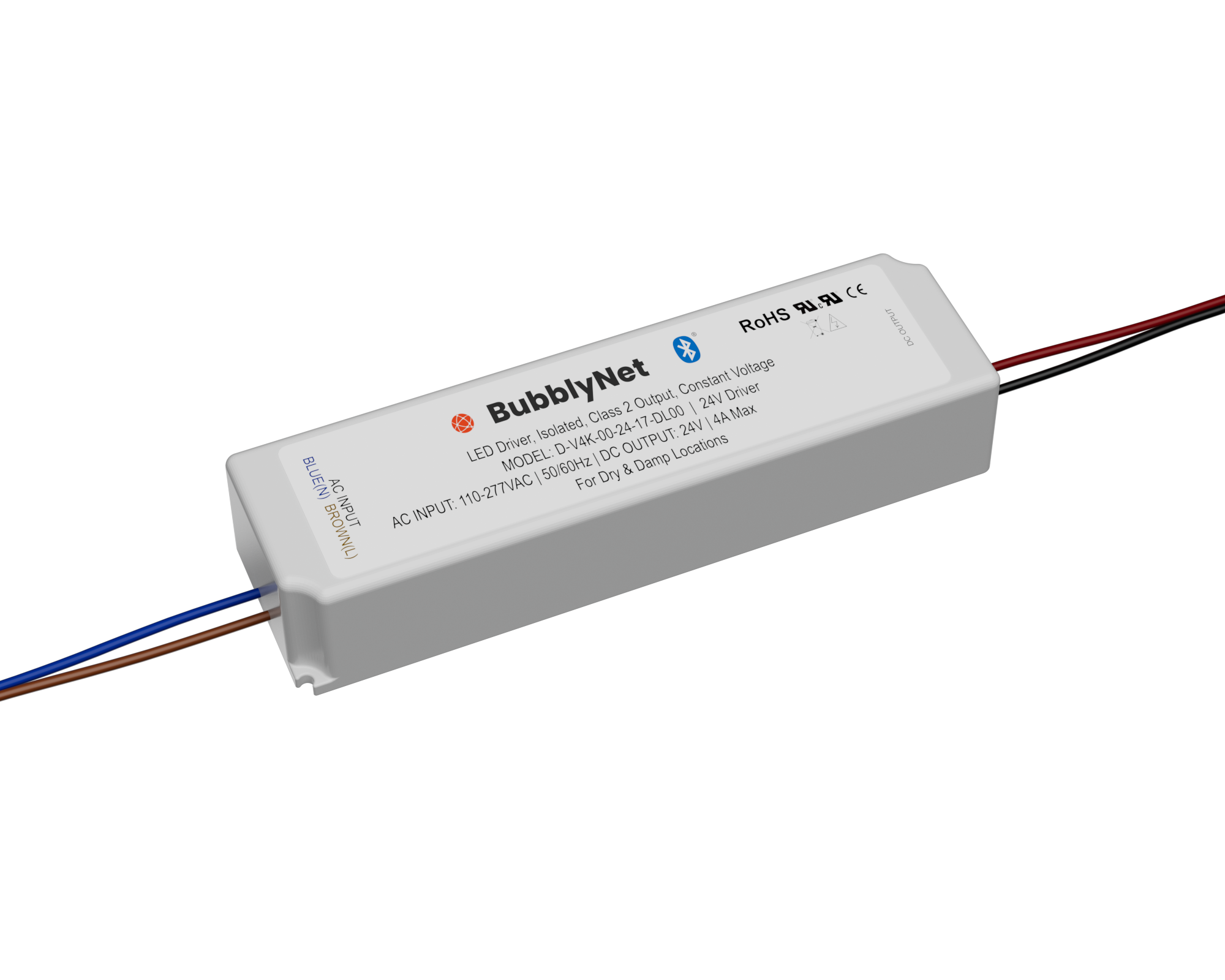 The D-V4K-00-24-17-DL00 operates on 110-277V. Once powered up, the device broadcasts its identification code waiting to be commissioned through the BubblyNet App. The installation of the D-V4K-00-24-17-DL00 is very simple. Install the driver as a standard non-dim 24VDC driver. As soon as the driver is powered on it will start broadcasting the non-provisioned advertising messages that will tell the provisioning app that a new device is ready to join. The provisioning app will connect to the new driver, configure security keys, addresses and other data so the new driver can join the Mesh Network. After the new driver joins the Mesh Network it is ready to be configured (publishing / subscribing data.)