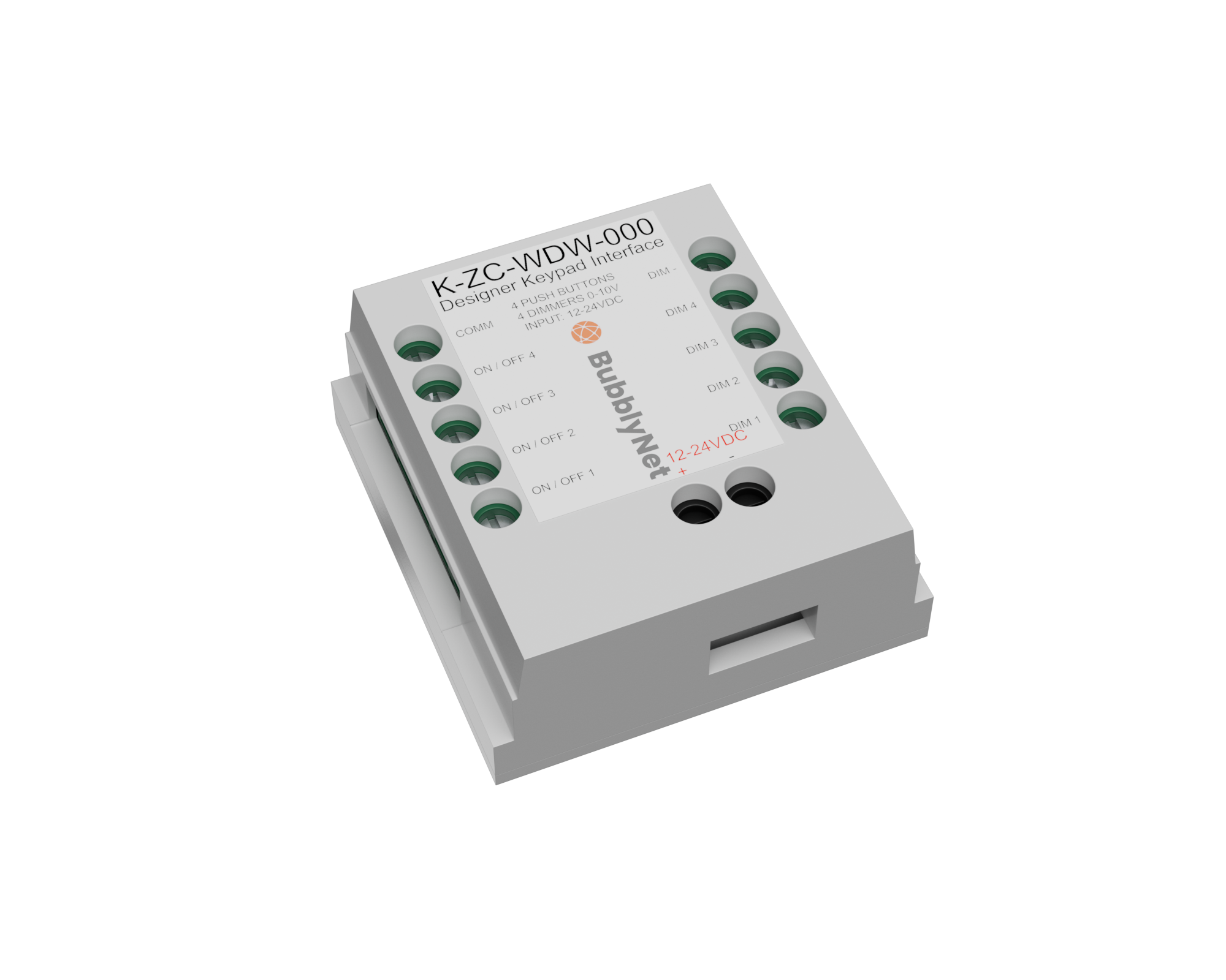 The Designer Keypad Interface is a wireless device that can be configured by the BubblyNet App. It allows to connect up to 4 analog (0-10V) inputs and 4 close contacts inputs thus converting third party keypads, dimmers and switches into smart wireless user interfaces.